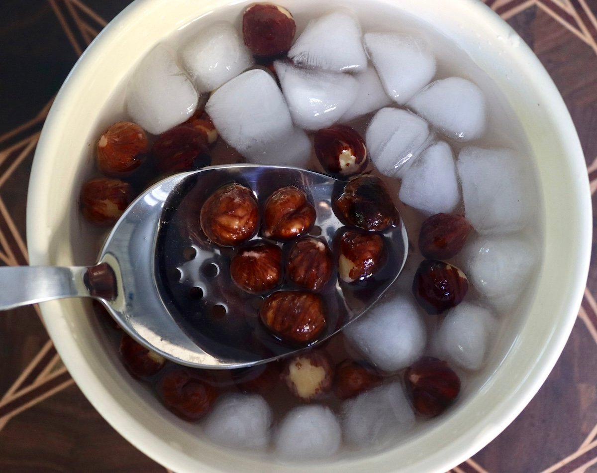 - Use a slotted spoon to remove the nuts and place them in the ice water. Then use your fingers to peel them - the skin should slide off easily. Dry them in a clean kitchen towel, roughly chop them, and then set them aside.