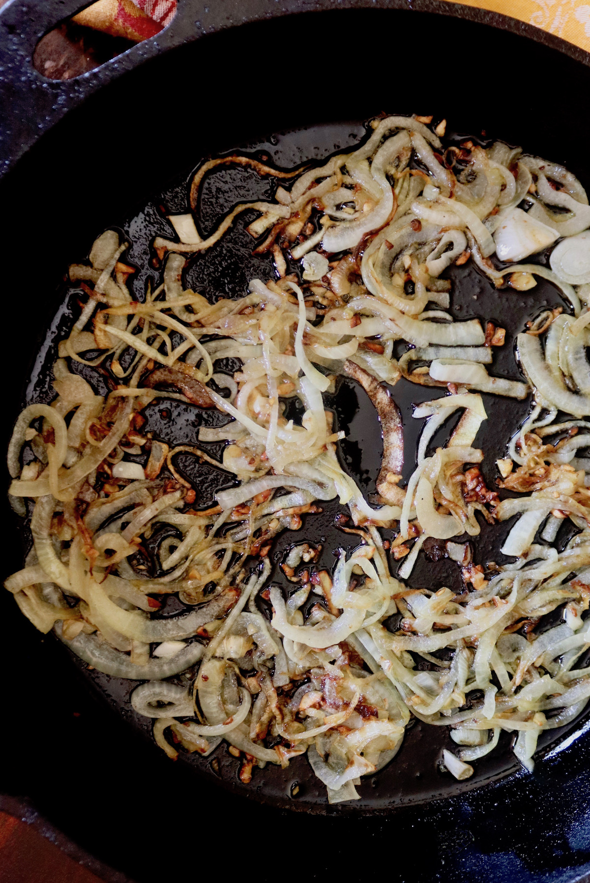- Add the onions and garlic to the same pan. Sauté, mixing often, until the onions are soft and beginning to brown.